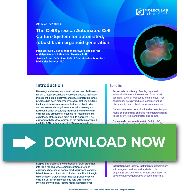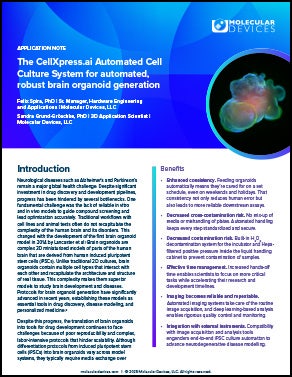 This application note presents an automated approach using the CellXpress.ai Automated Cell Culture System that ensures timely feeding, media agitation, and image-guided monitoring to support consistent growth and maturation of brain organoids over 100 days.